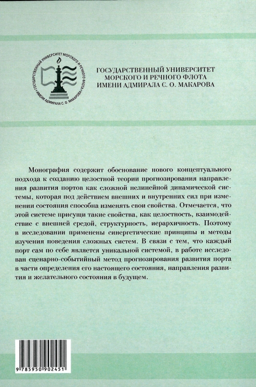 Монография содержит обоснование нового концептуального подхода к созданию целостной теории прогнозирования направления развития портов как сложной нелинейной динамической системы, которая под действием внешних и внутренних сил при изменении состояния способна изменять свои свойства. Отмечается, что этой системе присущи такие свойства, как целостность, взаимодействие с внешней средой, структурность, иерархичность. Поэтому в исследовании применены синергетические принципы и методы изучения поведения сложных систем. В связи с тем, что каждый порт сам по себе является уникальной системой, в работе исследован сценарно-событийный метод прогнозирования развития порта в части определения его настоящего состояния, направления развития и желательного состояния в будущем. Предназначено для студентов, аспирантов и преподавателей для использования в учебном процессе и научной деятельности, а также специалистов в их практической деятельности - при стратегическом планировании направления развития портов и разработке инвестиционных программ.