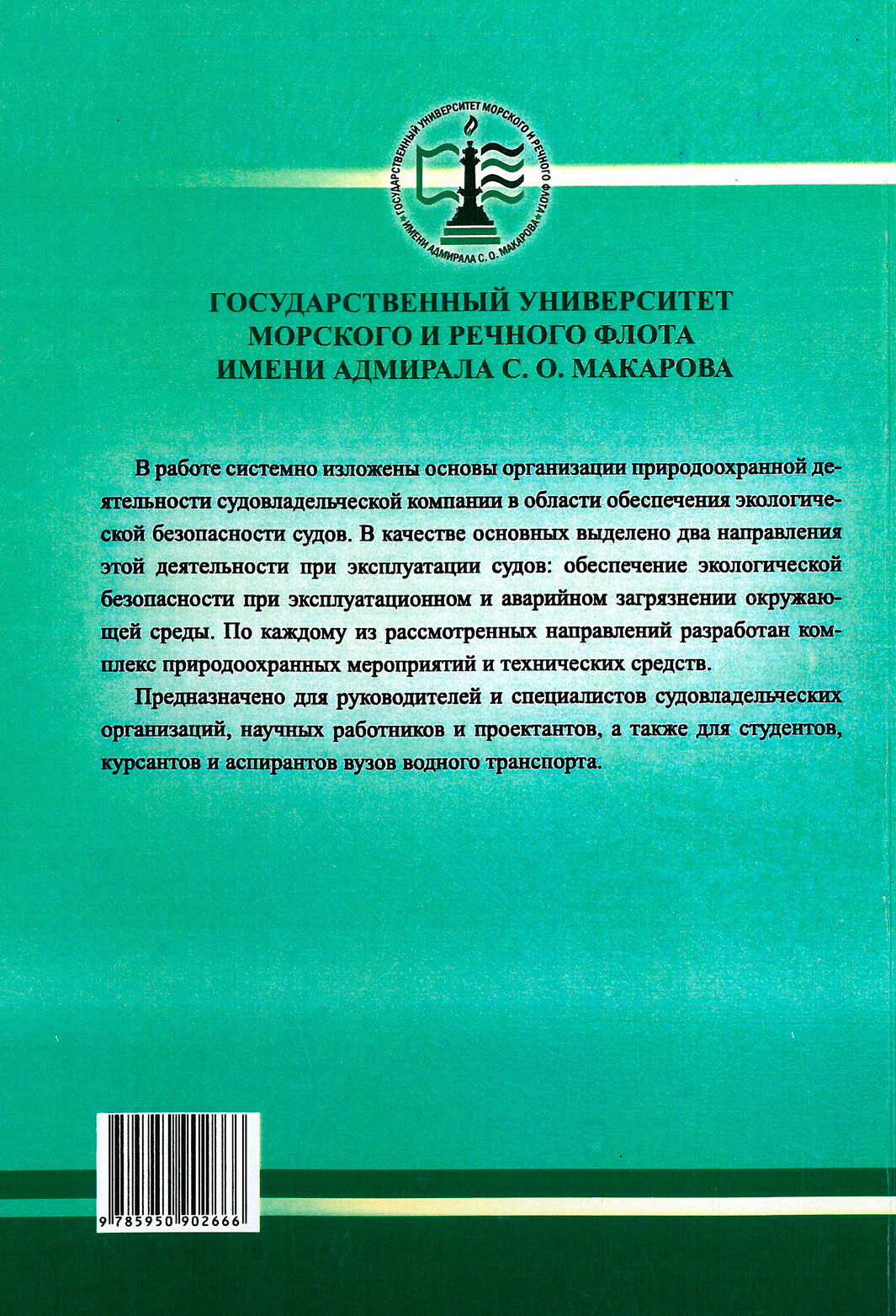 В работе системно изложены основы организации природоохранной деятельности судовладельческой компании в области обеспечения экологической безопасности судов. В качестве основных выделено два направления этой деятельности при эксплуатации судов: обеспечение экологической безопасности при эксплуатационном и аварийном загрязнении окружающей среды. По каждому из рассмотренных направлений разработан комплекс природоохранных мероприятий и технических средств.