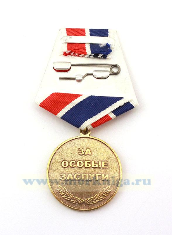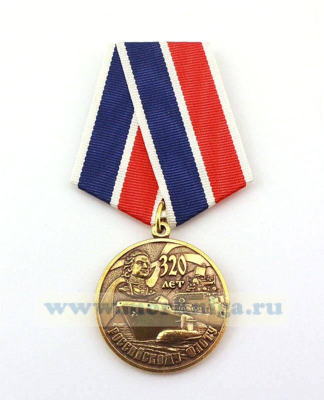 Медаль изготовлена из металла цвета бронзы. На лицевой стороне изображены военный корабль, подводная лодка, Петр I на фоне Андреевского флага и выбита дата «320 лет». По нижнему полукругу пущено «Российскому флоту». На оборотной стороне выбито «За особые заслуги», снизу перекрещенные веточки лавра и дуба.