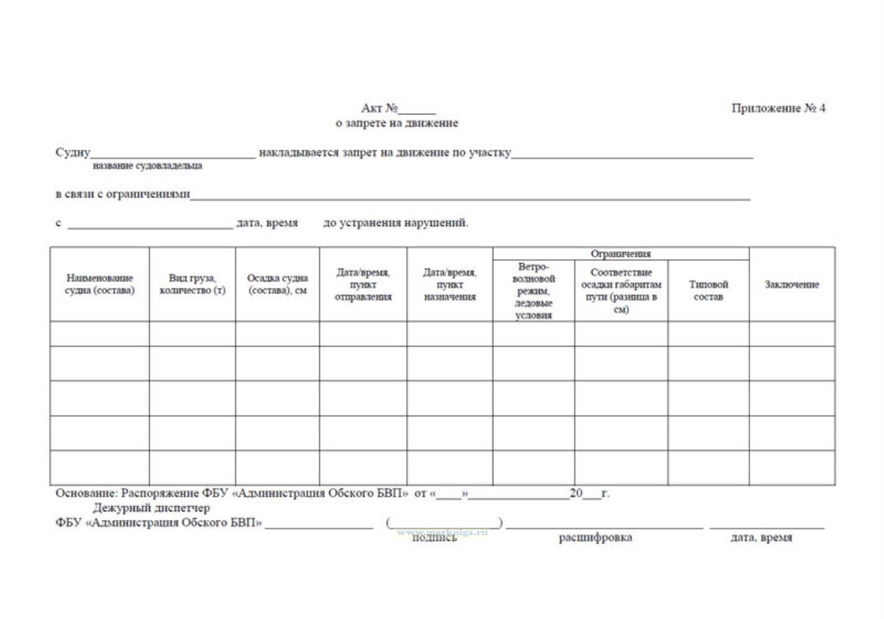В случаях несоблюдения каких-либо ограничений, диспетчерский аппарат ФБУ "Администрация Обского БВП" принимает меры по наложению запрета на движение судов по участку пути, отходу из пунктов, с рейдов ожидания (Приложение N 4 к Порядку диспетчерского регулирования движения судов на внутренних водных путях Обского бассейна) в целях обеспечения безопасности судоходства на ВВТ Обского бассейна.