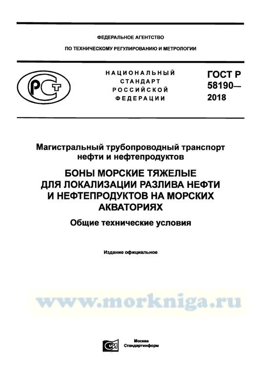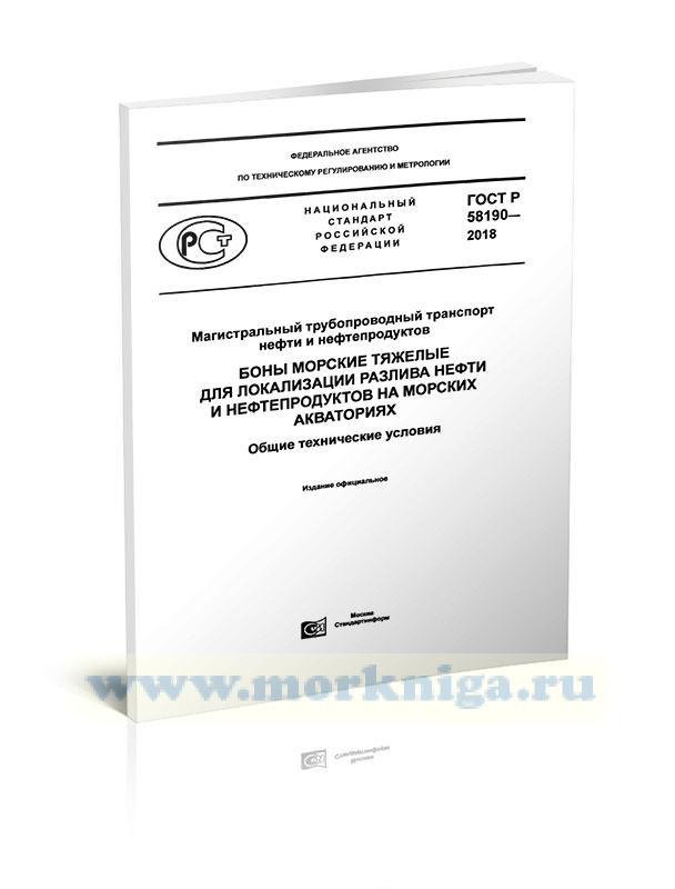 ГОСТ Р 58190-2018 "Магистральный трубопроводный транспорт нефти и нефтепродуктов. Боны морские тяжелые для локализации разлива нефти и нефтепродуктов на морских акваториях. Общие технические условия" утв. Приказом Федерального агентства по техническому регулированию и метрологии от 2 августа 2018 г. № 448-ст