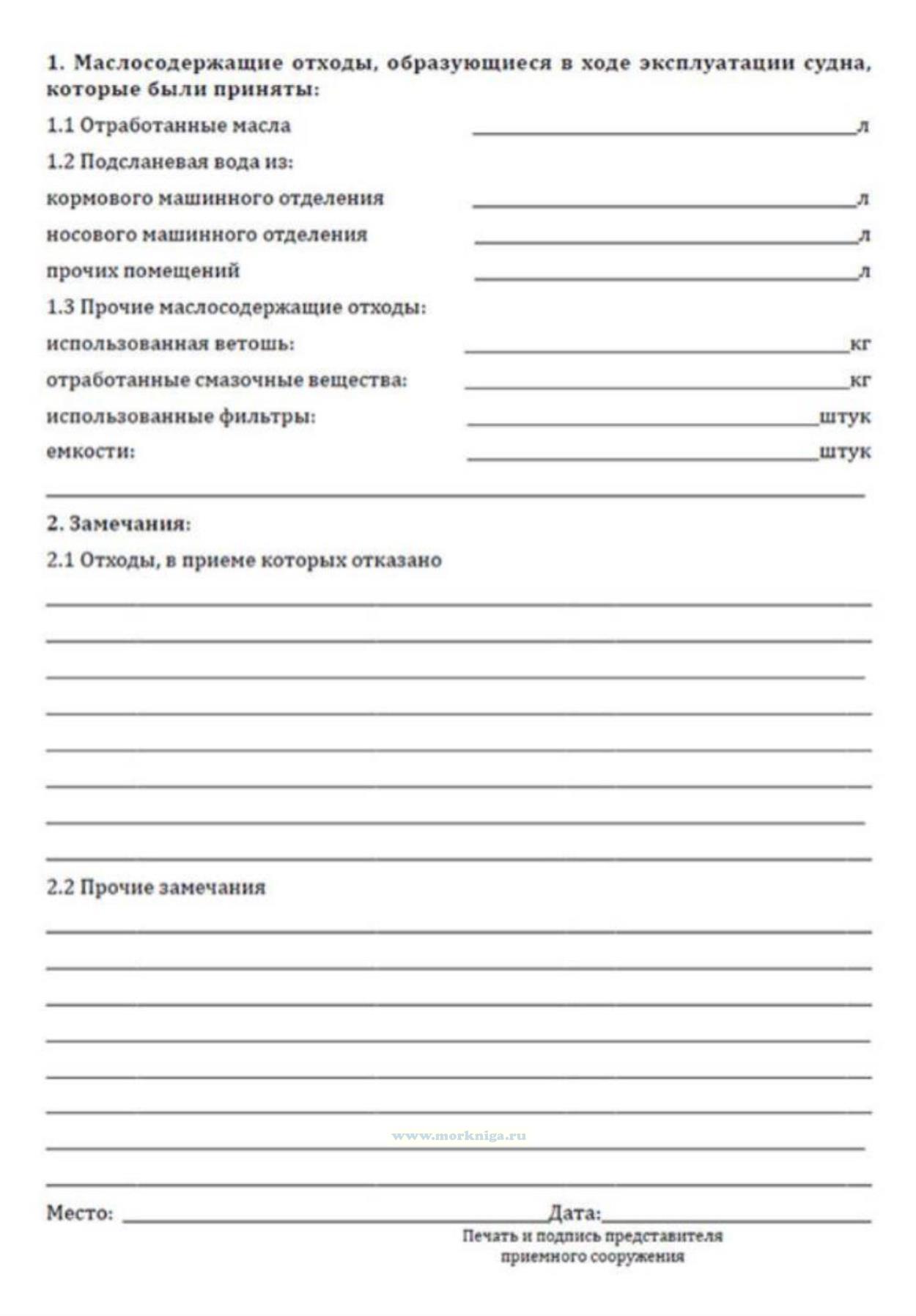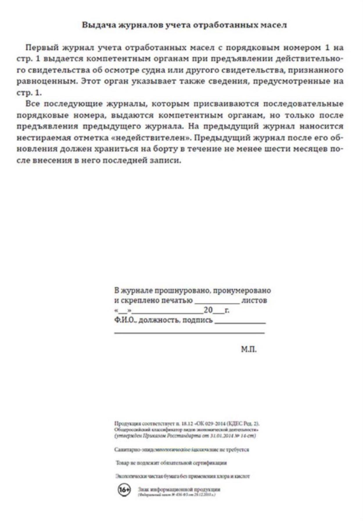 Первый журнал учета отработанных масел с порядковым номером 1 на стр. 1 выдается компетентным органам при предъявлении действительного свидетельства об осмотре судна или другого свидетельства, признанного равноценным. Этот орган указывает также сведения, предусмотренные на стр. 1.