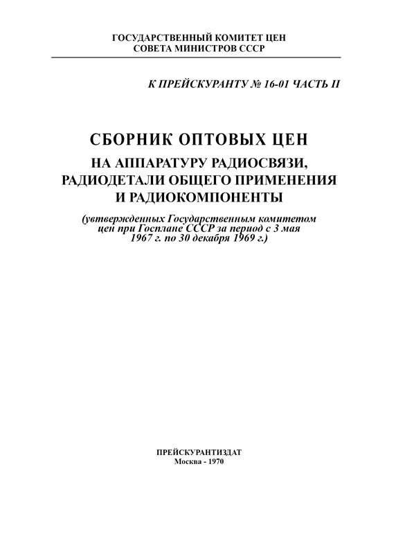 Сборник оптовых цен на аппаратуру радиосвязи, радиодетали общего применения и радиокомпоненты (утвержденных Государственным комитетом цен при Госплане СССР за период с 3 мая 1967 г. по 30 декабря 1969 г.)