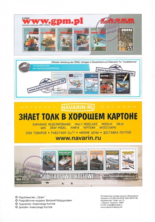 2. Блочная сборка, при которой каждая секция закрывается^р-двух сторон шпангоутом, образуя при этом блоки. Уже готовые блоки склеивают между собой для получения фюзеляжа или других элементов самолёта. При этом необходима тщательная подгонка двух соседних шпангоутов. Для желающих собрать модель этим способом имеется два набора шпангоутов.
