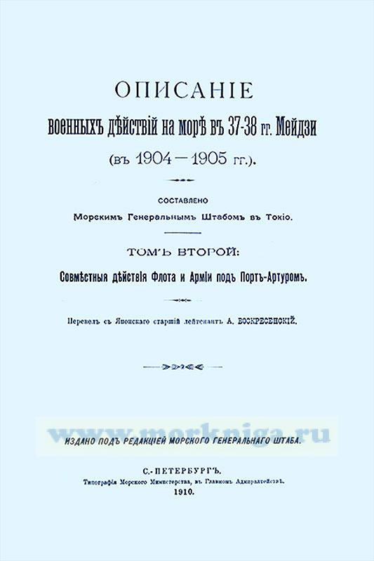 Продолжая издание официального японского «Описания военных действия на море в 1904-1905 гг.», Морской Генеральный Штаб выпускает в свет перевод второго тома, который заключает в себе описание совместных действий флота и армии под Порт-Артуром, начиная с высадки первого эшелона японской армии на материке и кончая падением крепости. Сюда пошли все имевшие место совместные операции сухопутных и морских сил Японии, действовавших против крепости, как то: перевозка, высадка и охрана десанта, деятельность транспортного флота и охранных судов, организация пунктов высадки, помощь флота армии и действия морских отрядов на берегу, а также весь последовательный ход событий на сухопутном фронте за время осады крепости.