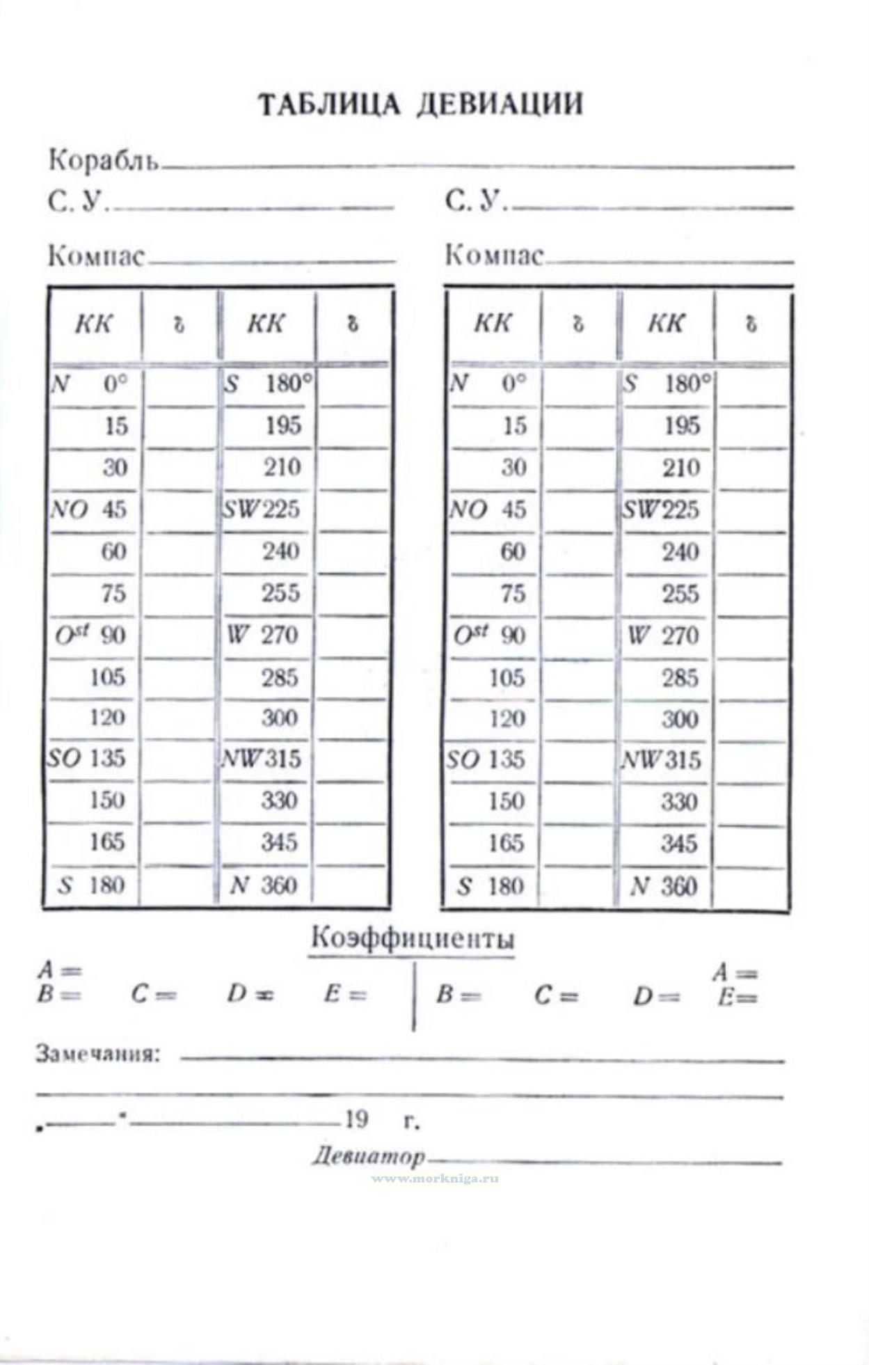 Таблица девиации – это таблица, составляемая на судах для каждого магнитного компаса в результате определения и вычисления девиации. В ней указывается величина девиации в зависимости от курса корабля.