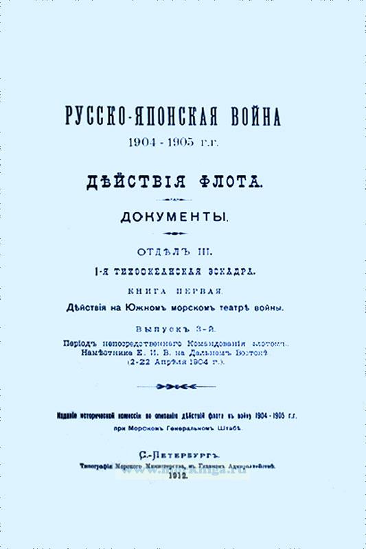 В состав настоящего выпуска документов из Архива Русско-Японской войны при Морском Генеральном Штабе, избранных Комиссией по Описанию Действий Флота в войну 1904-1905 г.г. для издания в печати – вошли документы, касающиеся действий судов эскадры в Порт-Артуре за время – со 2 апреля, когда Наместник Е.И.В. на Дальнем Востоке, прибыв в Порт-Артур после гибели Вице-Адмирала Макарова, принял непосредственное командования флотом, - и до 22 апреля т.е. до вступления в командование эскадрою Контр-Адмирала Фитгефта и отъезда Наместника из Порт-Артура.