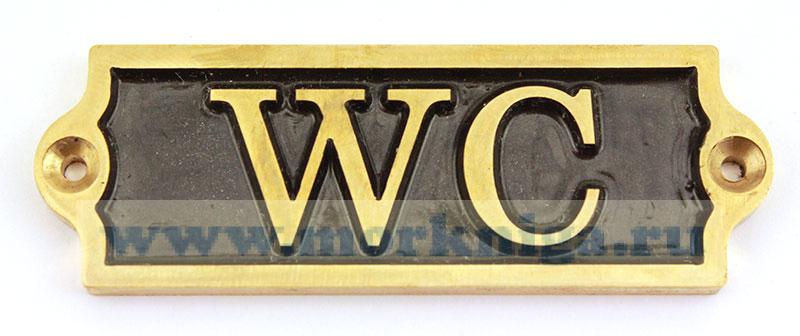 Табличка "WC" создана в золотистом цвете, служит информационным указателем.