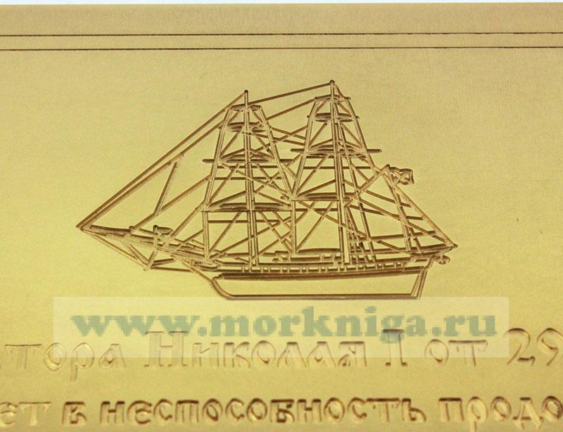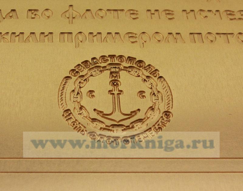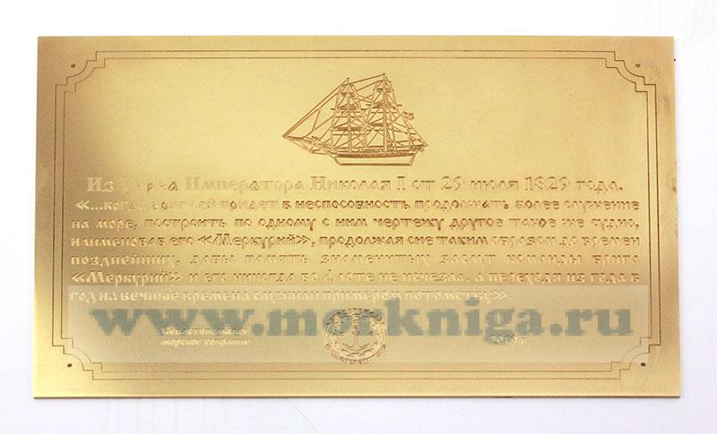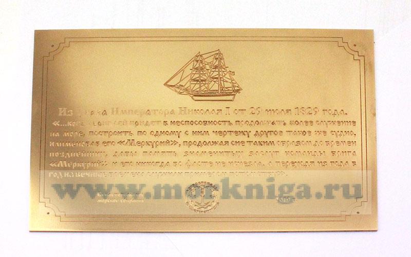 Латунная табличка содержит гравировку корабля, логотипа заказчика, а также текст-цитату из Указа Императора Николая II.