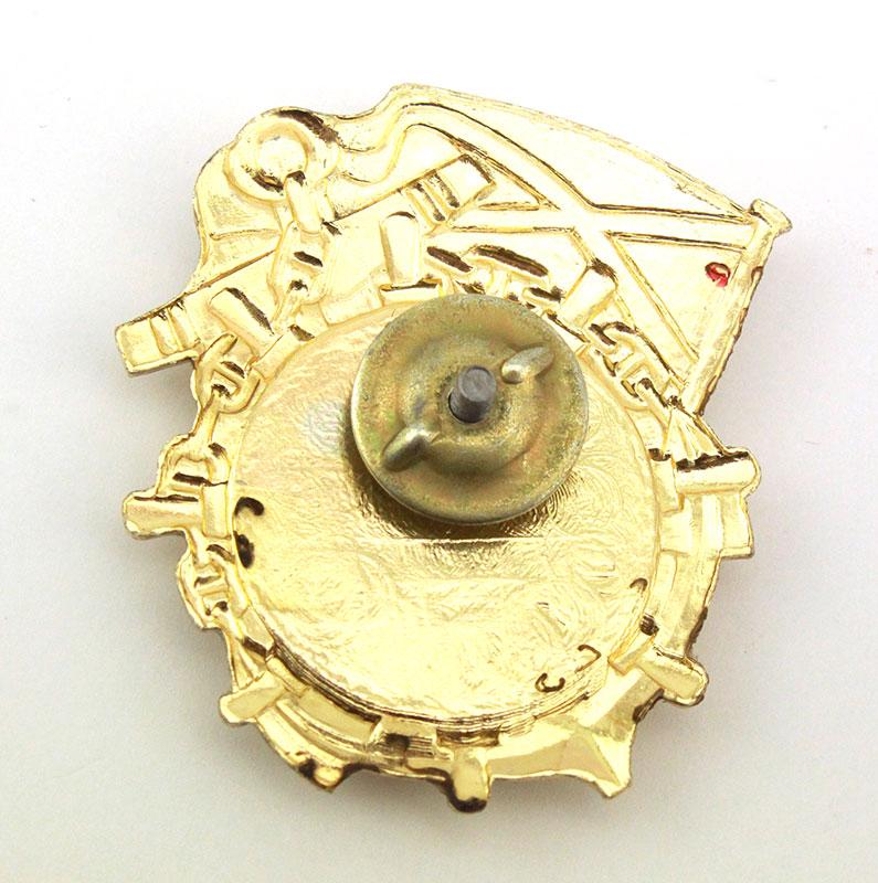 Нагрудный знак выполнен в форме якоря, по центру знака расположена эмблема с изображением дельфина на синем фоне – отличительный знак для служащих в морской пехоте. Слева расположен Андреевский флаг.