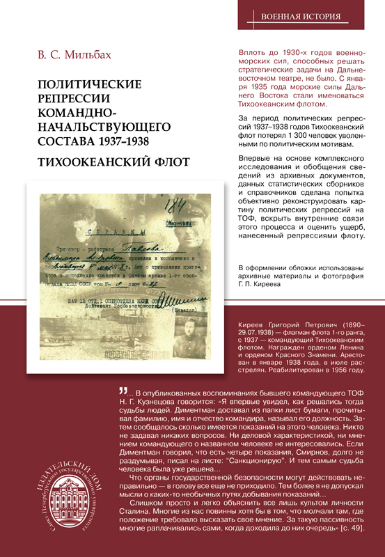 В книге на основании ранее не опубликованных источников рассматривается проблема политических репрессий 1937-1938 гг. среди командного и начальствующего состава Тихоокеанского флота. Приводимые авторами сведения помогают воссоздать исторически объективную картину происходившего, понять, что скрывается за статистикой репрессий, оценить влияние внутриполитических событий на обороноспособность дальневосточных морских рубежей страны накануне Второй мировой войны.