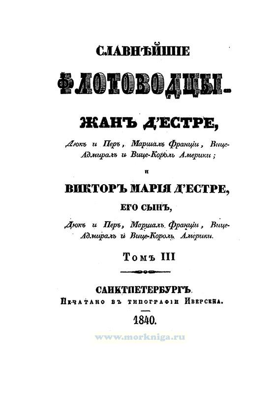 Издавая описание жизни двух Маршалов д`Естре, мы намеревались возвысить душу вступающих в морскую службу, возбудить их мужество, представляя им образцы для подражания. Почитая их достойными находиться в числе морских героев, мы старались отыскивать возможные материалы, для обнародования их подвигов.