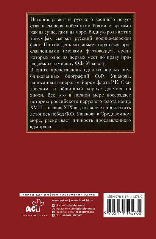 Основу книги составляет одна из первых опубликованных биографий Ф.Ф. Ушакова, написанная генерал-майором флота Р.К. Скалов-ским, которая дополнена обширным корпусом документов эпохи. Книга в полной мере воссоздает историю российского парусного флота конца XVIII — начала XIX в., позволяет проследить летопись побед Ф.Ф. Ушакова в Средиземном море, раскрывает личность прославленного адмирала, который в 2004 году Архиерейским собором Русской православной церкви был причислен к лику общецерковных святых подвижников.