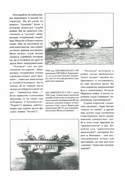 "Эссексы" вступили в войну, когда требовалось ''всего только'' свалить потрясенного и оглушенного, но еще могучего врага. На этих кораблях американский флот заканчивал Вторую Мировую войну. А потом союзники стали главными "вероятными противниками''.