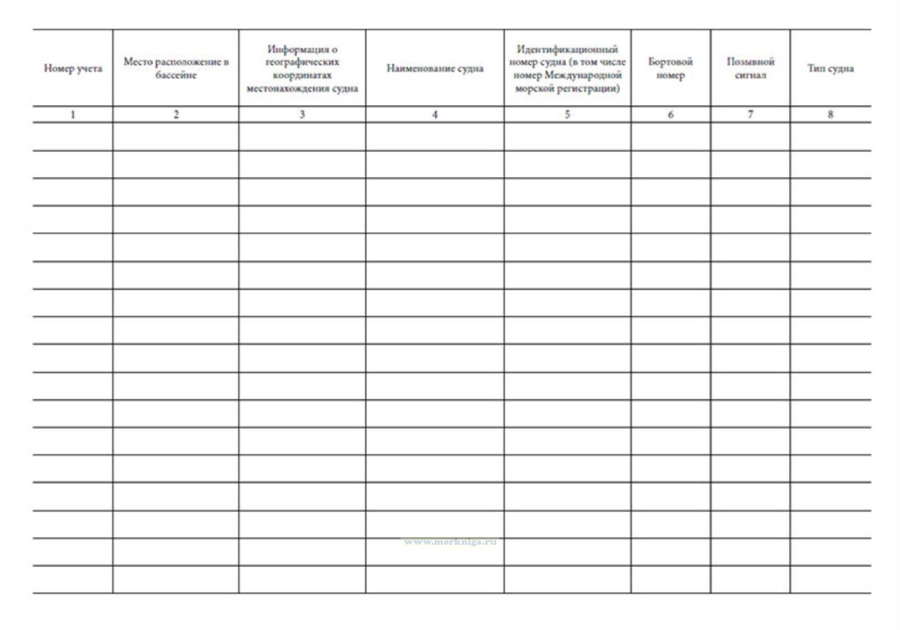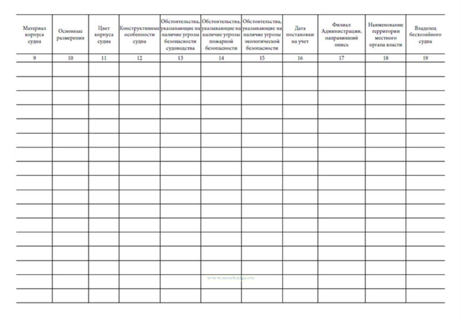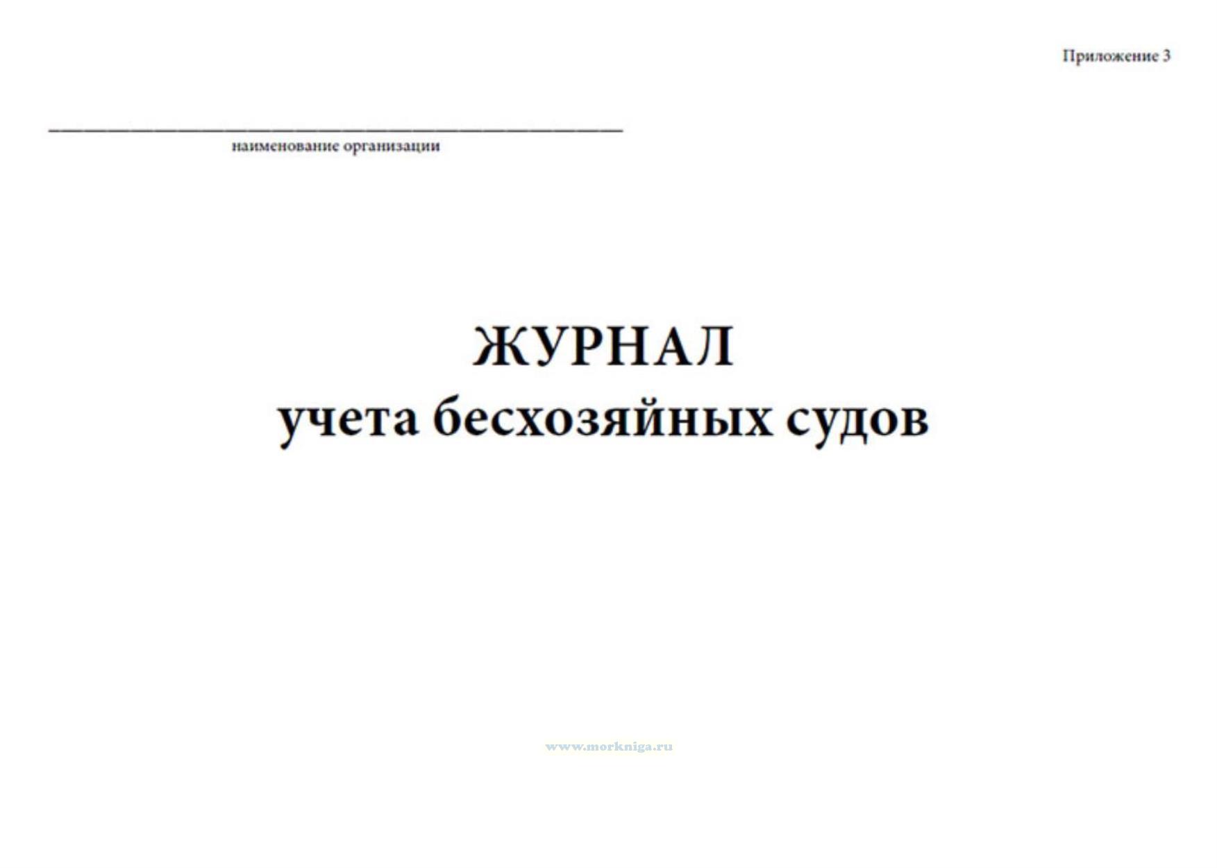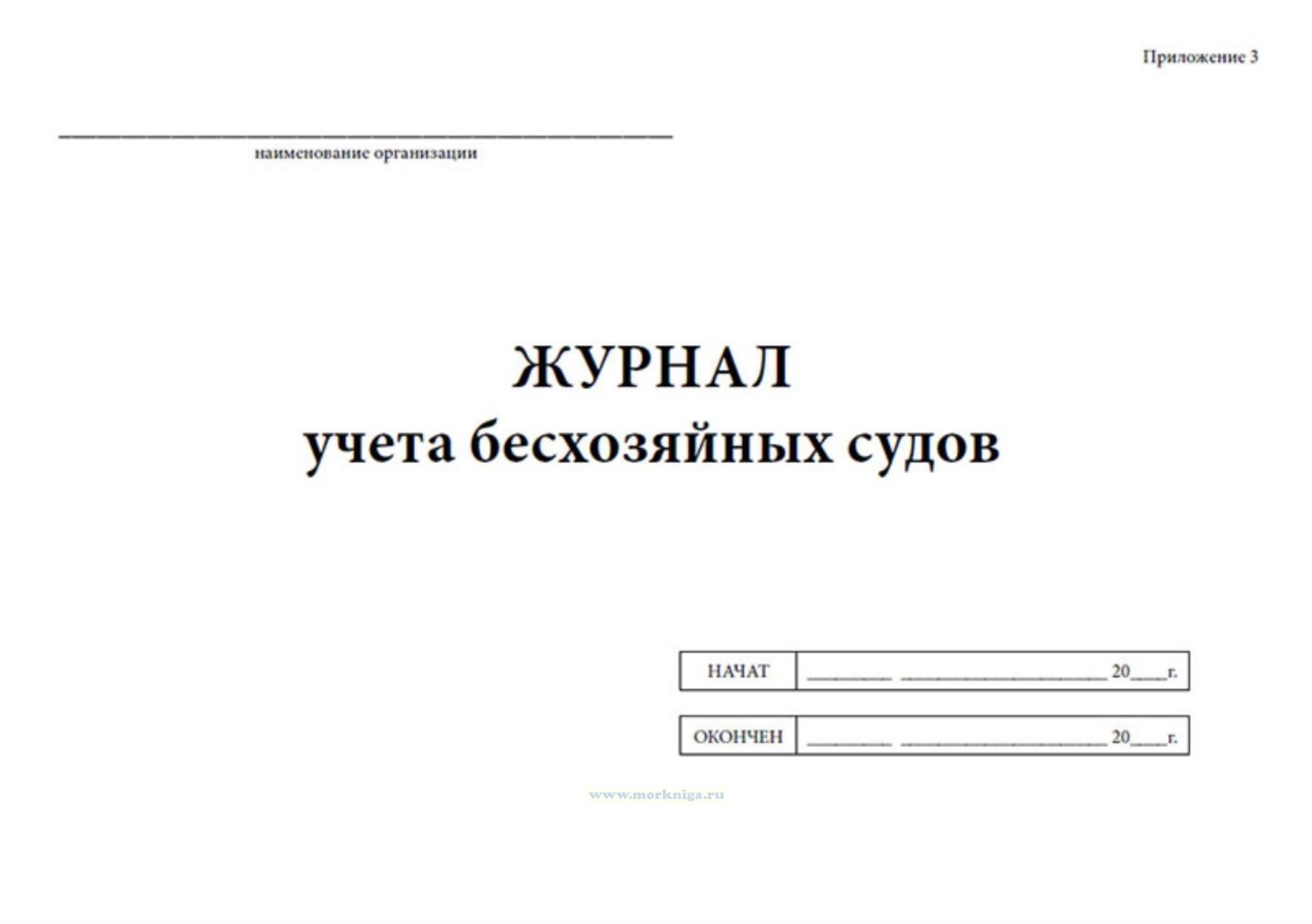 Форма журнала учета бесхозяйных судов соответствует Приложению 3 к Положению о порядке выявления и учета бесхозяйных судов и работе с затонувшим имуществом на внутренних водных путях Волжского бассейна, организуемой службой пути в рамках своих полномочий