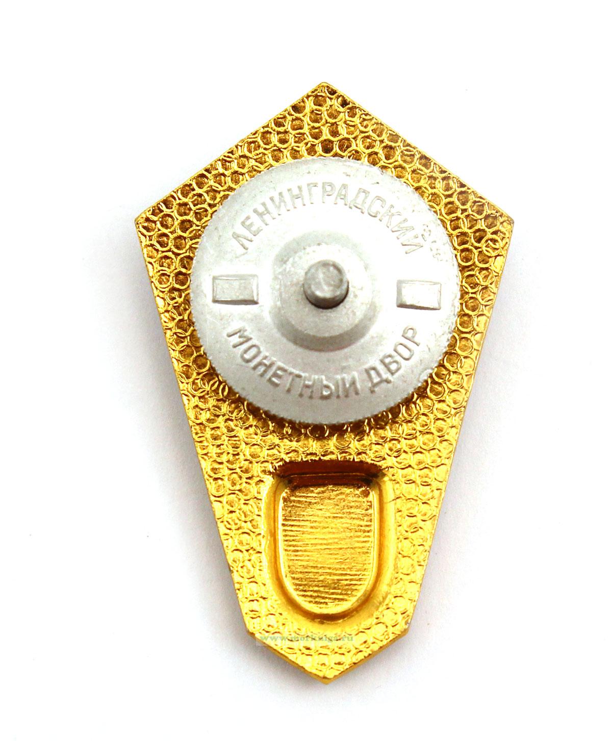 Цвет эмали синий, эмблема – скрещенные французский ключ и молот.