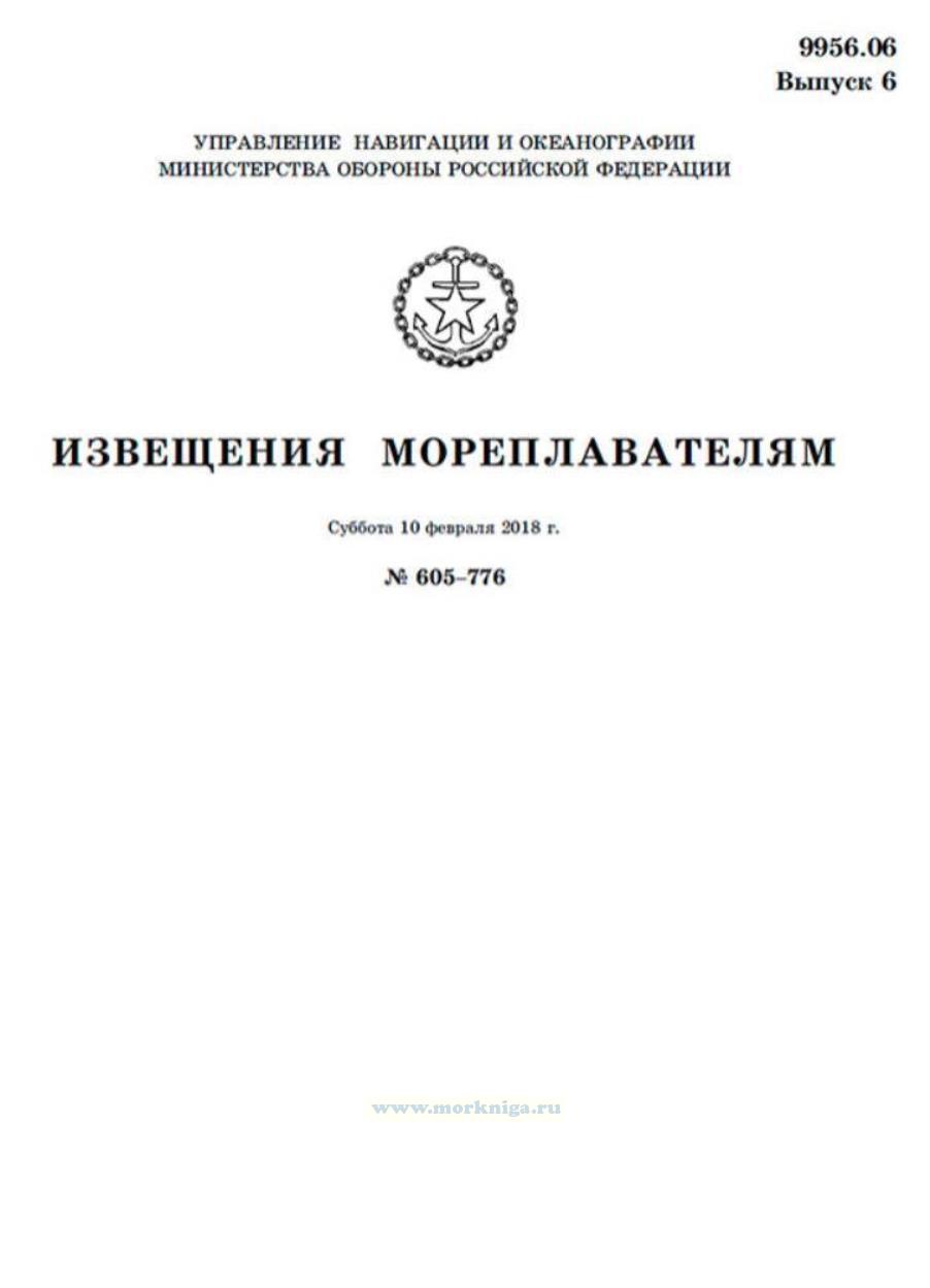 Извещения мореплавателям. Выпуск 6. № 605-776 (от 10 февраля 2018 г.) Адм. 9956.06