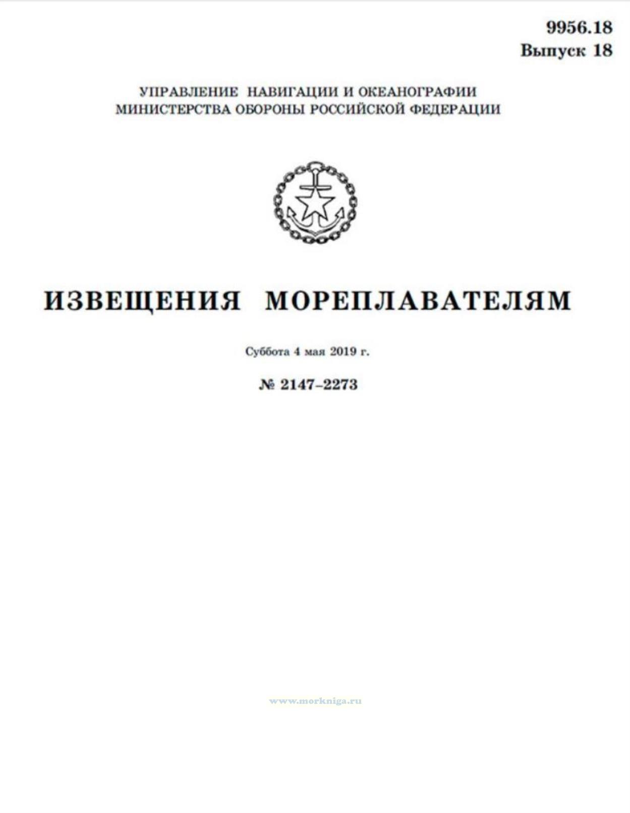 Извещения мореплавателям. Выпуск 18. № 2147-2273 (от 4 мая 2019 г.) Адм. 9956.18