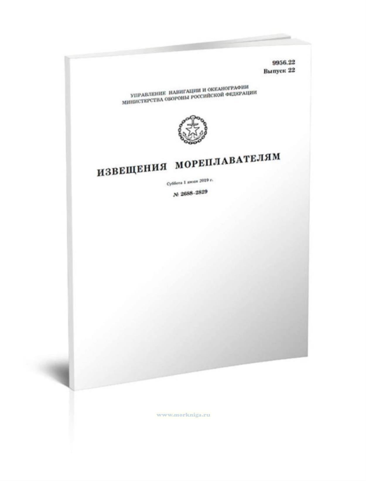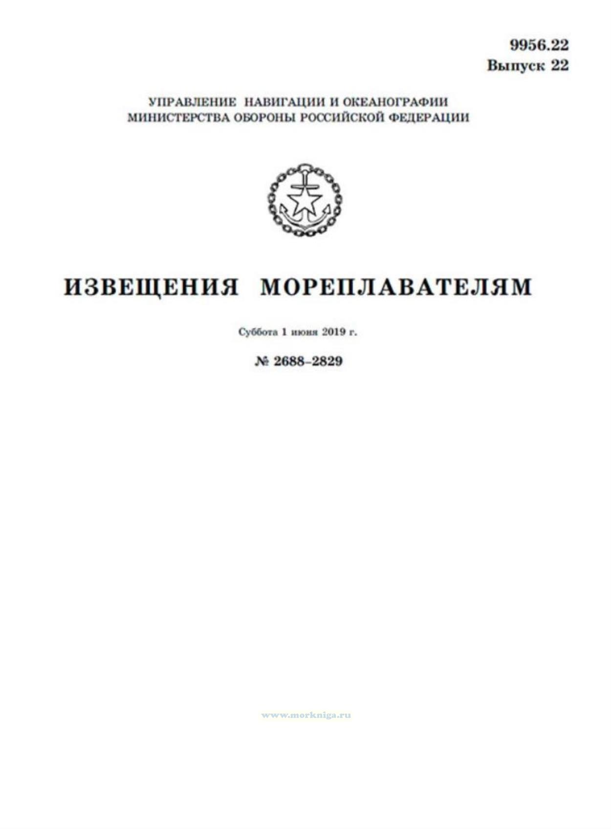 Извещения мореплавателям. Выпуск 22. № 2688-2829 (от 1 июня 2019 г.) Адм. 9956.22