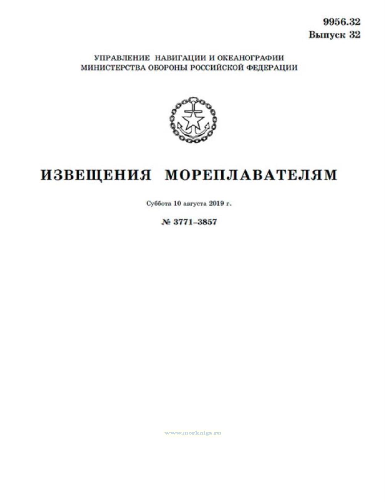 Извещения мореплавателям. Выпуск 32. № 3771-3857 (от 10 августа 2019 г.) Адм. 9956.32