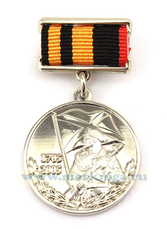 Лицевую сторону юбилейного знака занимает изображение воина на фоне флага ВМФ, сжимающего автомат. Слева нанесены памятные года «1705-2005».