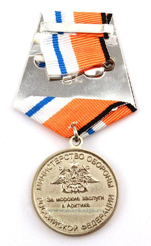 Оборотная сторона награды имеет надпись, расположенную по кругу «Министерство Обороны Российской Федерации». В верхней ее части помещено рельефное изображение герба ВМФ, который представлен в виде двуглавого орла с распростертыми крыльями. В лапах орла находится пара перекрещенных адмиралтейских якорей за его спиной. На груди орла расположен треугольный щит со штоком, который восходит к короне. В поле щита изображен всадник, который копьем поражает дракона. Под щитом размещена рельефная надпись в две строки: «За морские заслуги в Арктике».