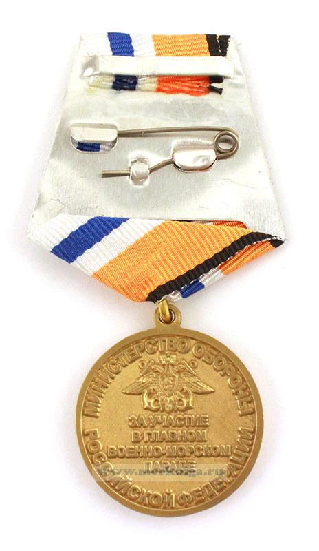 На оборотной стороне медали: в центре сверху - рельефное изображение средней эмблемы Военно-Морского Флота. Под ней рельефная надпись в четыре строки: "За участие в Главном военно-морском параде"; по кругу - рельефная надпись: в верхней части - "Министерство Обороны", в нижней части - "Российской Федерации".