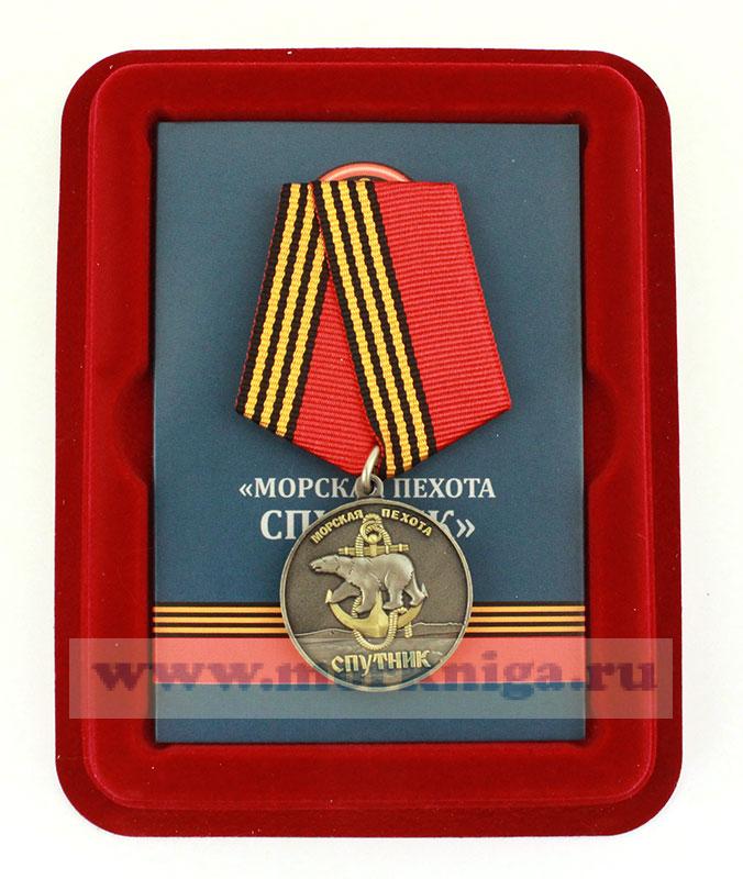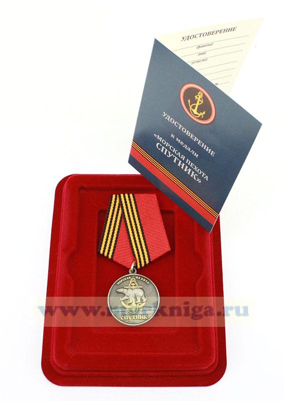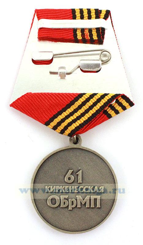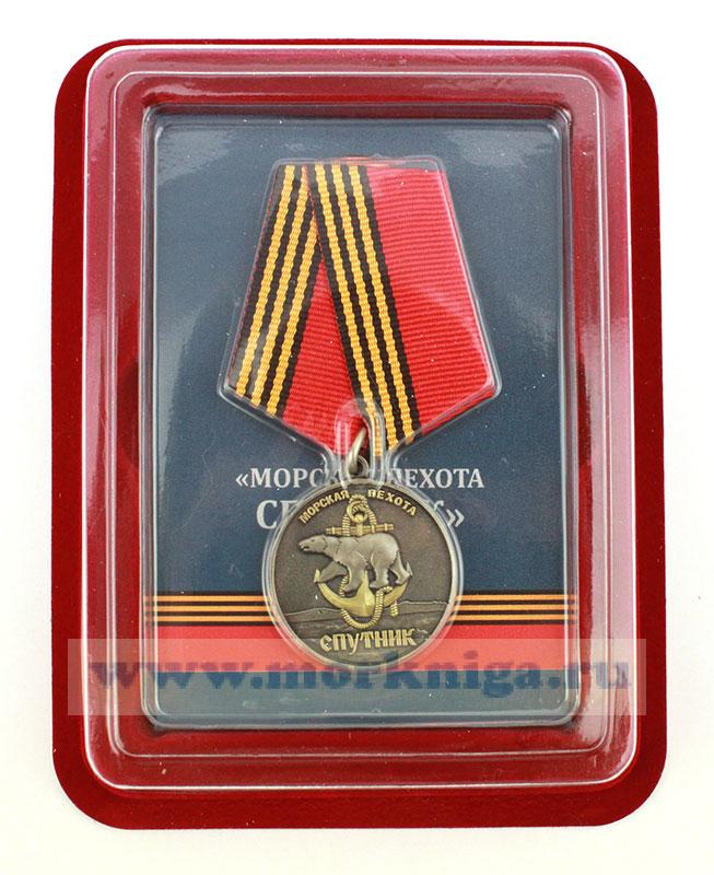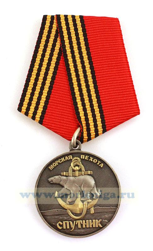 Медаль "Морская пехота. Спутник. 61 Киркенесская ОБрМП" изготовлена из темно-серебристого металла, имеет форму круга диаметром 32 мм с выпуклым бортиком с обеих сторон. Лицевую сторону медали занимает изображение медведя. На заднем фоне помещен якорь. По верхнему полукругу надпись «Морская пехота», по нижнему – «Спутник». На оборотной стороне в три строки выбито «61 Киркенесская ОБрМП».