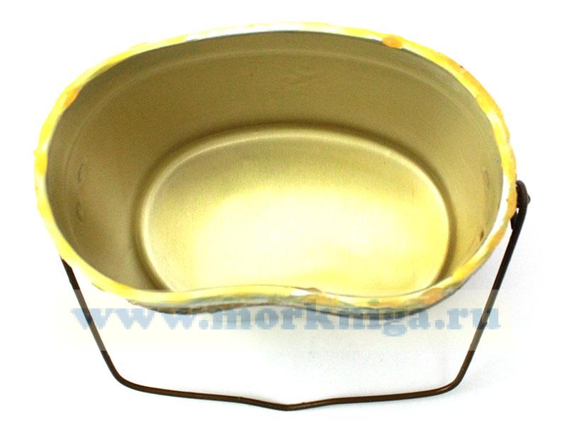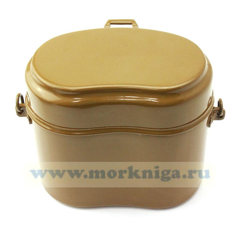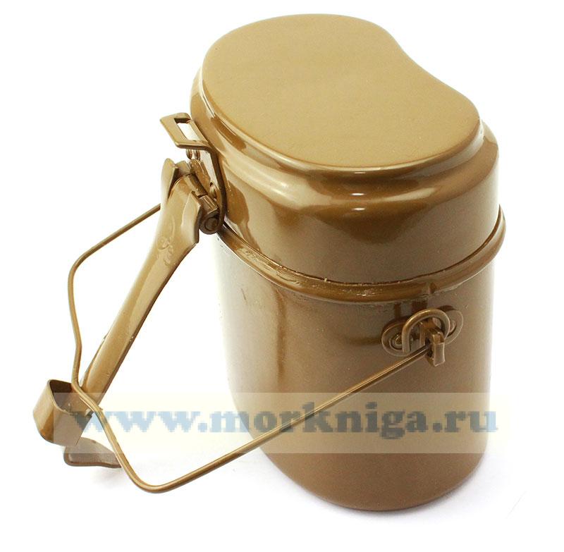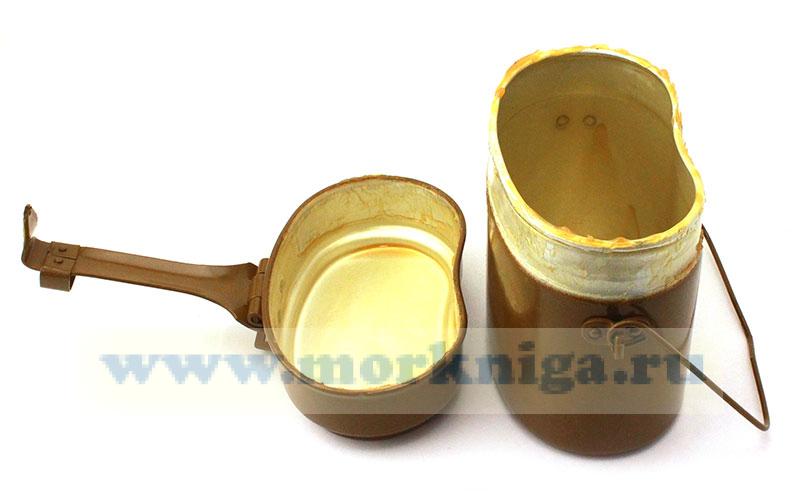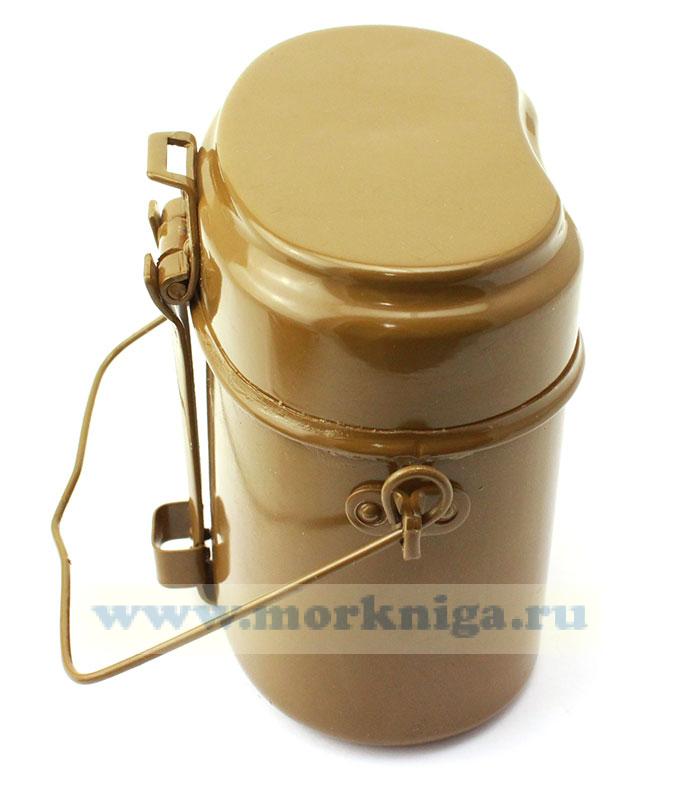 Котелок изготовлен из цельнотянутого пищевого алюминия и имеет защитную окраску. Снабжен проволочной рукояткой-петлей для подвешивания и переноски. Выпуклая форма котелка позволяет его носить на поясе.
