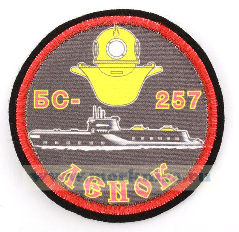 Шеврон "БС - 257 Ленок" - круглой формы чёрного цвета с изображением подводной лодки и скафандра.