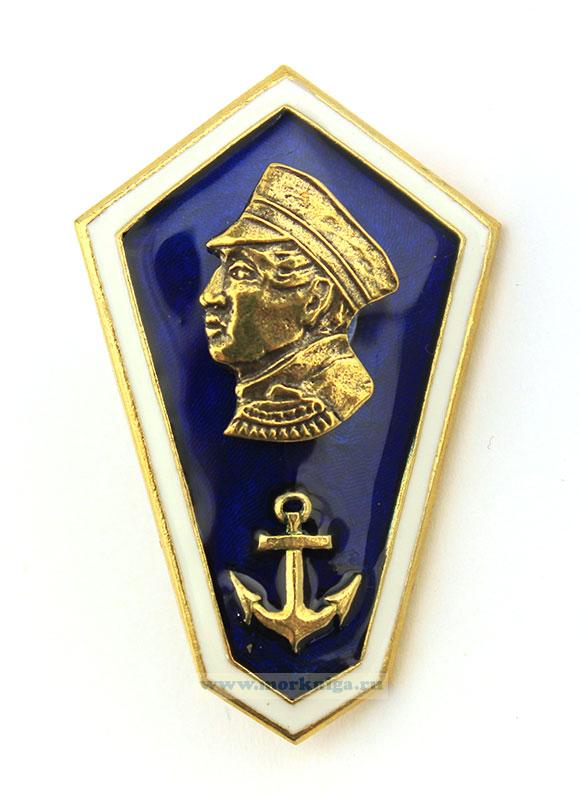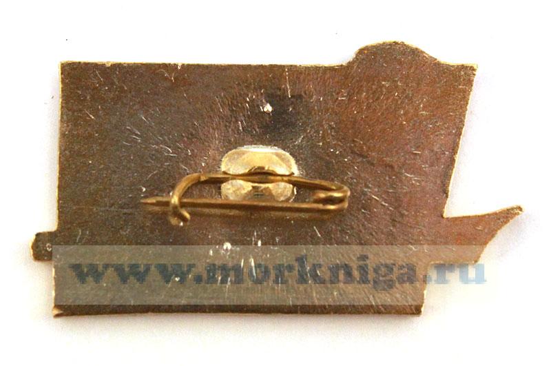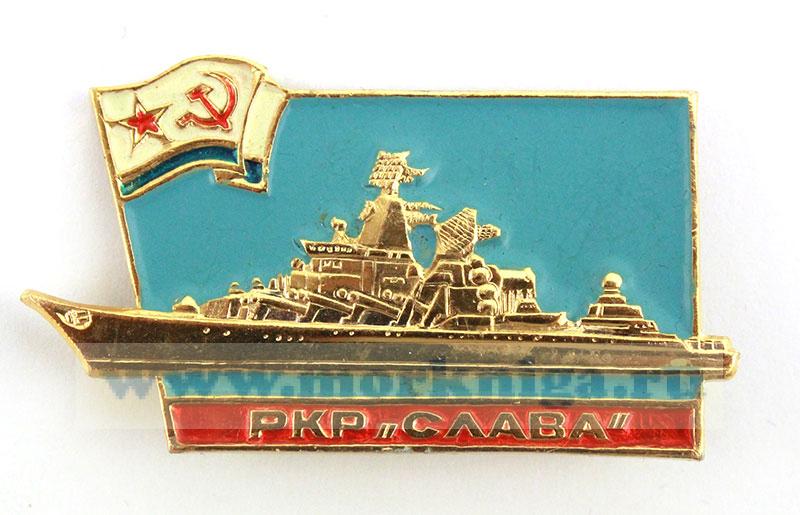 По центру знака на голубом фоне объемное изображение крейсера. В левом верхнем углу размещен флаг ВМФ СССР. Снизу на красном фоне надпись – РКР «Слава».
