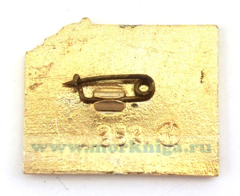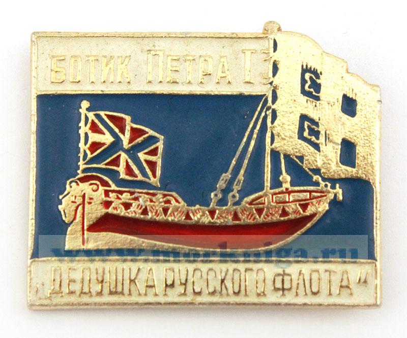 По центру знака на голубом фоне объемное изображение ботика. Сверху на белом фоне надпись «Ботик Петра I», снизу – «Дедушка русского флота».