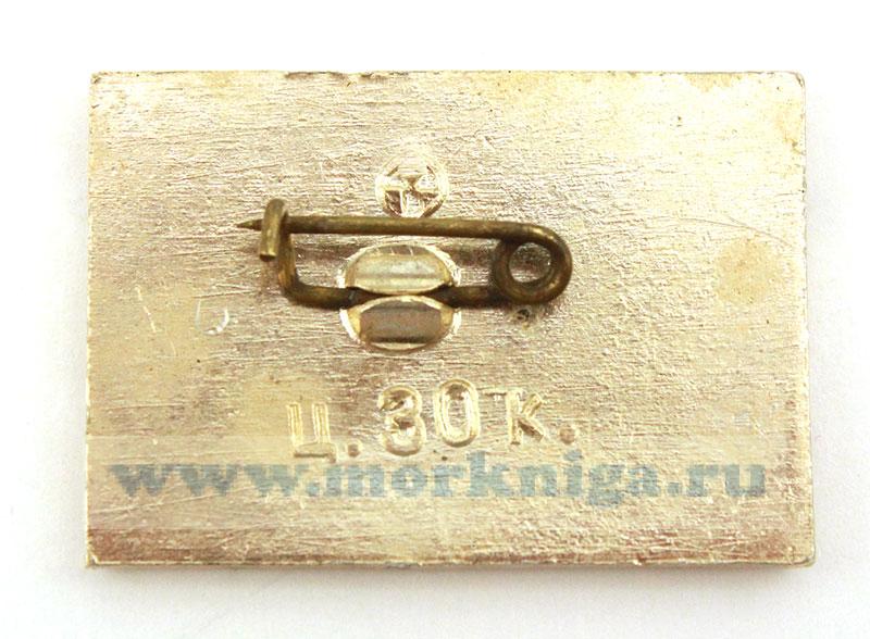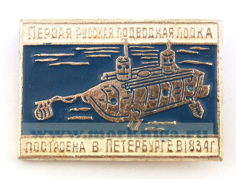 По центру знака на голубом фоне объемное изображение подводной лодки. Сверху на белом фоне надпись «Первая русская подводная лодка», снизу – «построена в Петербурге в 1834 г».