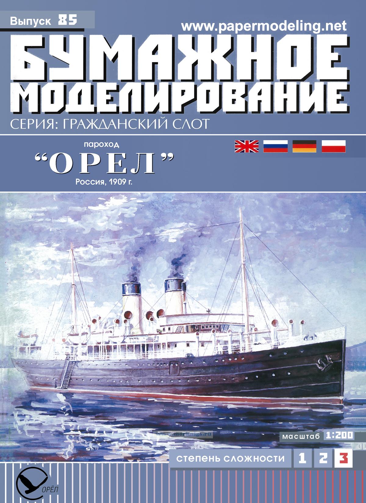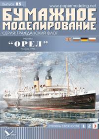 Согласно договору фирма обязывалась построить 5 одновинтовых первоклассных почтово-пассажирских пароходов спардечного типа. Так как суда планировалось использовать для специальной службы в военное время, предусматривались крепления для установки 3 120-мм пушек, место для укладки на палубе рельсов для перевозки из трюмов на корму мин заграждения. Внутренние поме-щения рассчитывались на перевозку 600 человек десанта. Количество гражданских пассажиров планировалось так: в каютах 1-го класса - 62 пассажира, 2-го класса - 20 пассажиров, 3-го класса - 100 пассажиров. Штат судового состава включал 95 человек. 13 апреля 1909 г. строящимся судам были присвоены имена: трем большим – «Орёл», «Полтава», «Рязань»; остальным – «Симбирск», «Пенза». 1 августа 1909 г. пароход «Орёл» вышел на испытания, и уже в конце года начал выполнять рейсы на Дальнем Востоке вместе с «Полтавой». С началом I мировой войны «Орёл» вошел в состав Сибирской флотилии в качестве вспомогательного крейсера и был оснащен боевыми орудиями: двумя 120-мм, двумя 75-мм и четырьмя 47-мм. В дальнейшем использовался как учебный корабль.