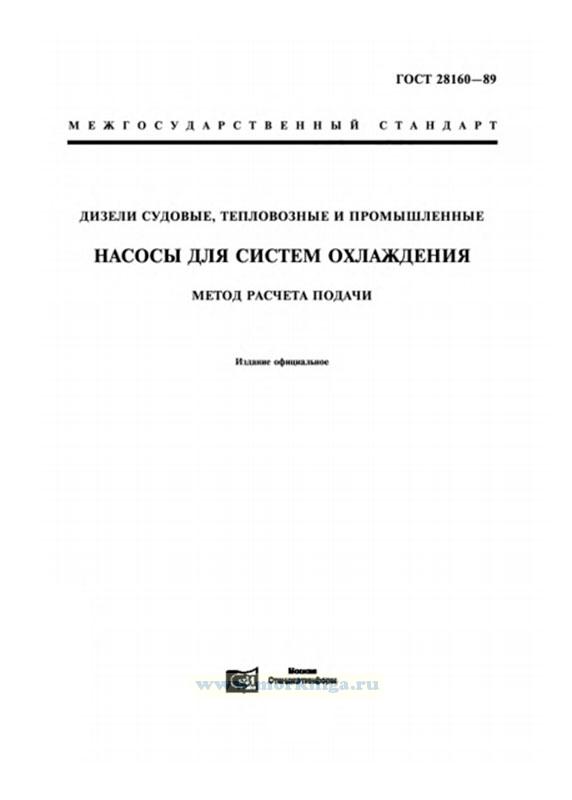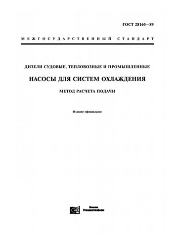 ГОСТ 28160-89 "Дизели судовые, тепловозные и промышленные. Насосы для систем охлаждения. Метод расчета подачи" утв. Постановлением Государственного комитета СССР по стандартам от 20.06.89 N 1760