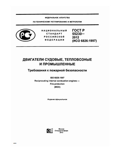 ГОСТ Р 55230-2012 "Двигатели судовые, тепловозные и промышленные. Требования к пожарной безопасности" утв. Приказом Федерального агентства по техническому регулированию и метрологии от 27 ноября 2012 г. N 1259-ст