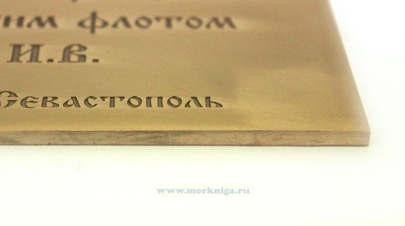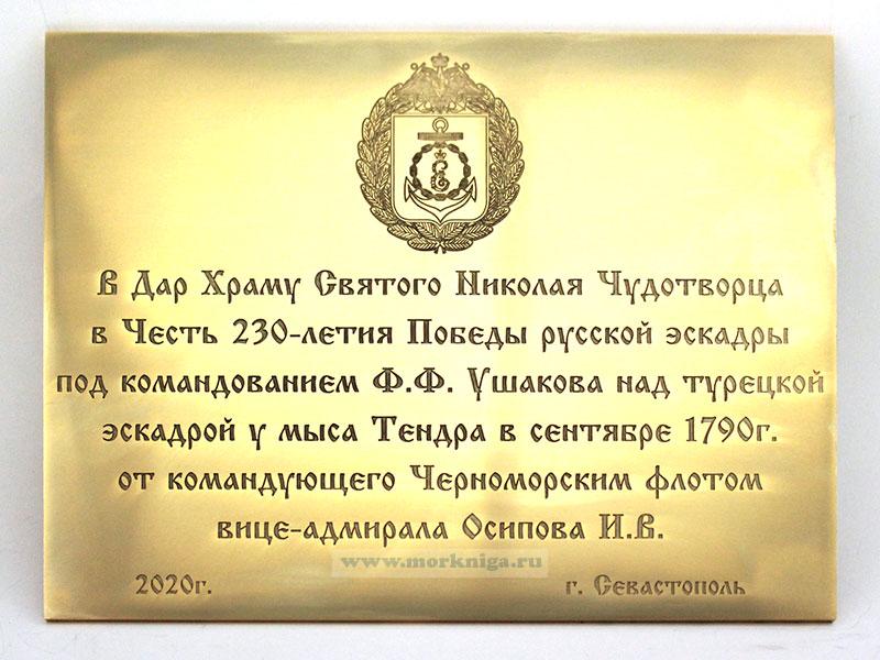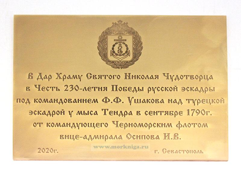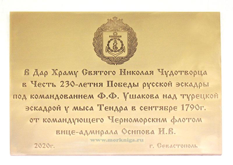 Морская табличка с надписью «В Дар Храму Святого Николая Чудотворца в Честь 230-летия Победы русской эскадры под командованием Ф.Ф. Ушакова над турецкой эскадрой у мыса Тендра в сентябре 1790 г. от командующего Черноморским флотом вице-адмирала Осипова И.В.».