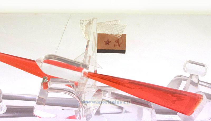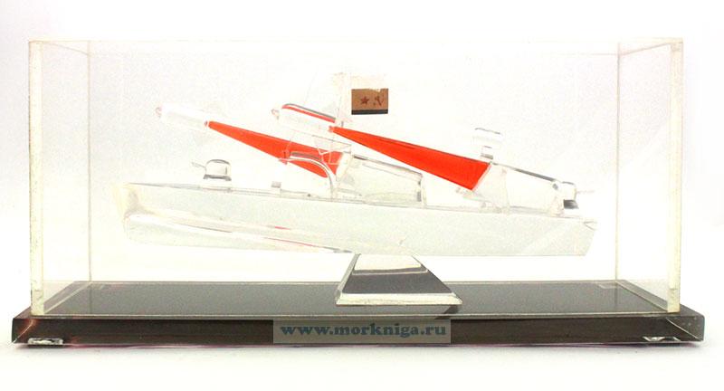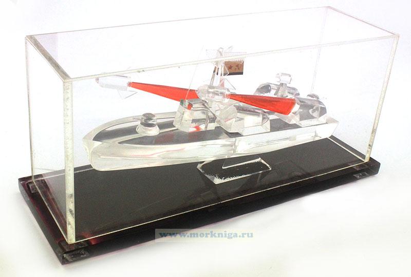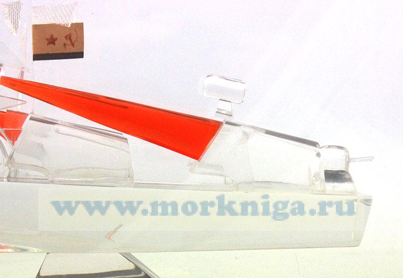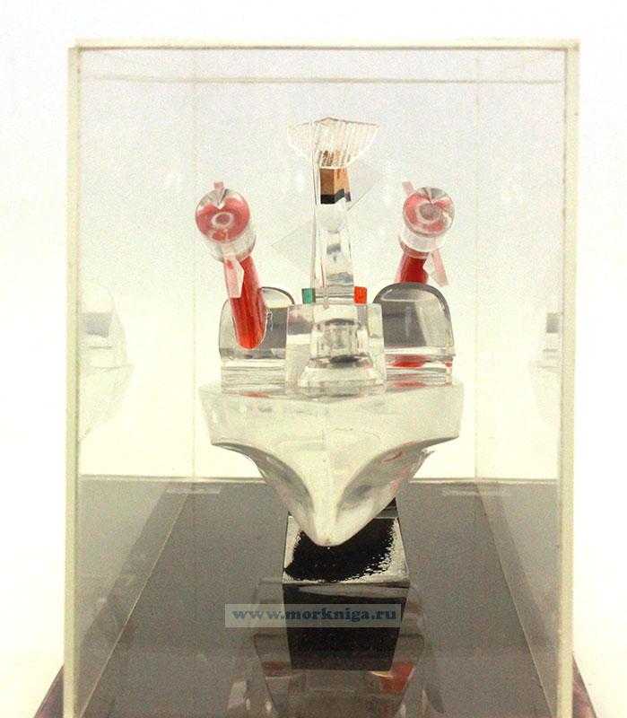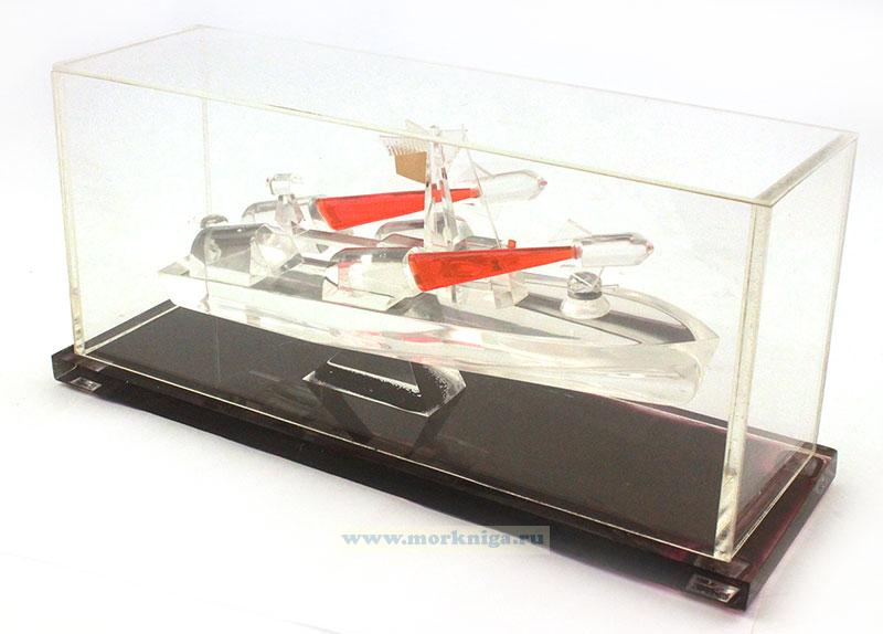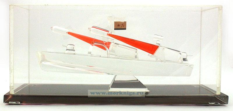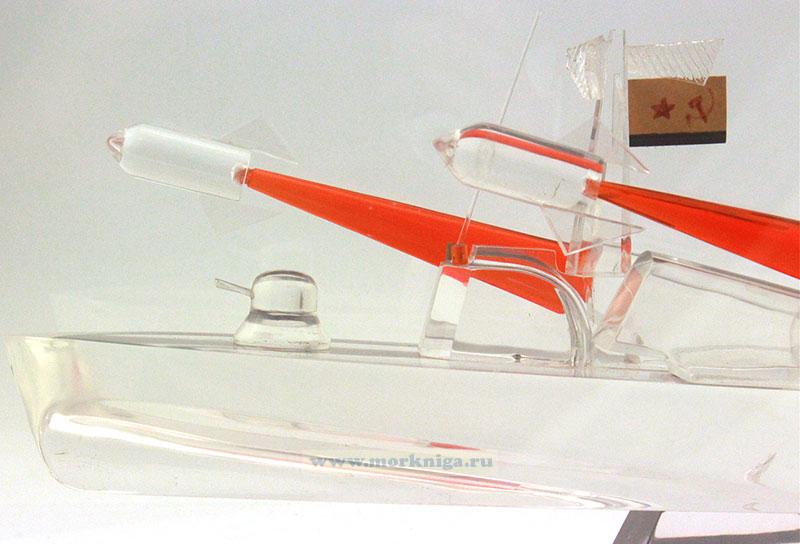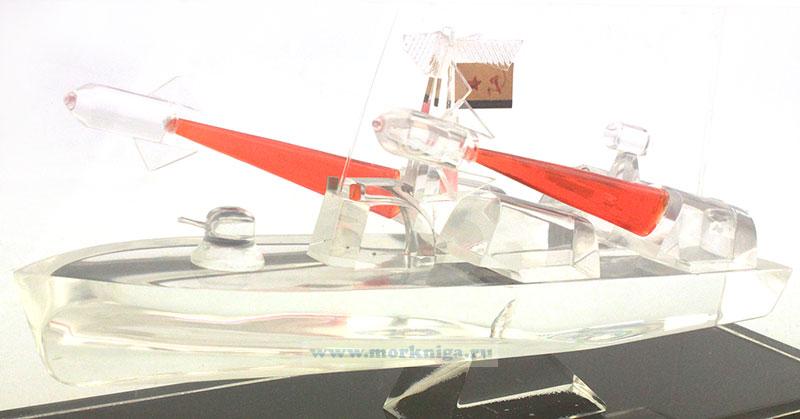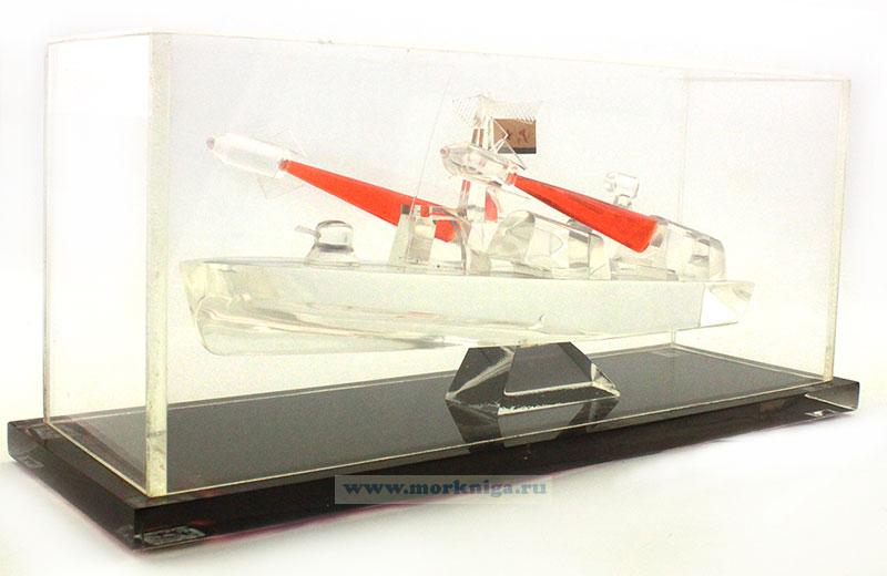 На макете изображен пуск ракет с малого торпедного корабля, помещенный в прозрачный корпус.