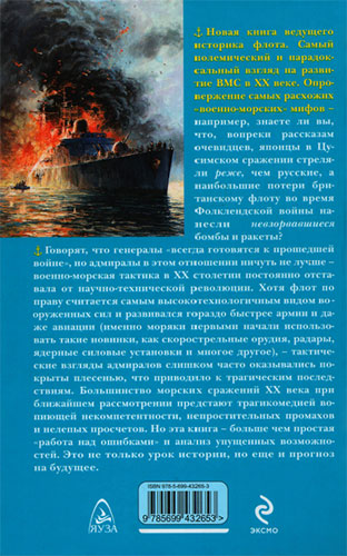 Новая книга ведущего историка флота. Самый полемический и парадоксальный взгляд на развитие ВМС в XX веке. Опровержение самых расхожих "военно-морских мифов" - например, знаете ли вы, что, вопреки рассказам очевидцев, японцы в Цусимском сражении стреляли реже, чем русские, а наибольшие потери британскому флоту во время Фолклендской войны нанесли невзорвавшиеся бомбы и ракеты?