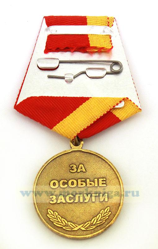 На оборотной стороне нанесено «За особые заслуги». Нижняя часть декорирована скрещенными лавровыми ветвями.