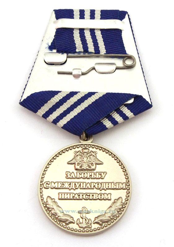 На лицевой стороне награды изображен корабль, на котором установлен Андреевский флаг, ниже нанесен символ пиратов - Веселый Роджер за решеткой. Круг медали обрамляет корабельная цепь. Оборотную сторону занимает эмблема ВМФ - двуглавый орел на якорях, посвящение «За борьбу с международным пиратством» и якорь, украшенный двумя ветвями лавра. По кругу оборотной стороны нанесены орнаментальные точки. Медалью награждаются военнослужащие ВМФ за обеспечение безопасности при прохождении судов по неспокойным морским территориям, а также за спасение людей и судов, захваченных пиратами.