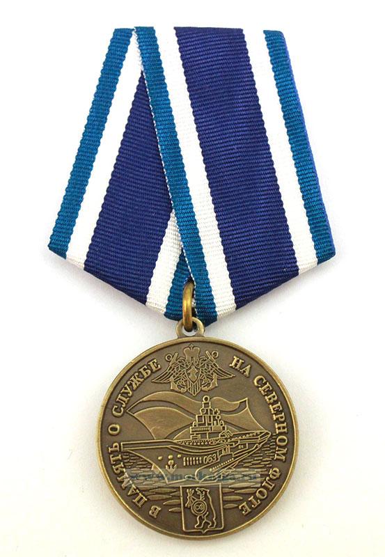 На лицевой стороне по центру изображение военного корабля на фоне Андреевского флага. Верхнюю часть занимает эмблема ВМФ. Надпись по кругу «В память о службе на Северном флоте». Снизу герб Северного флота. На оборотной стороне выбито «Честь, Отечество, отвага». Ниже якорь, обвитый канатом и лавровый венок.