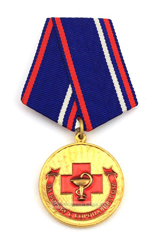 По центру лицевой стороны алый крест, в него вписан символ медицины – чаша, которую обвивает змея. Снизу полукругом помещена красная лента, с надписью «За борьбу с коронавирусом». На обратной стороне надпись в три строки: «За особые заслуги», снизу две лавровые ветви.