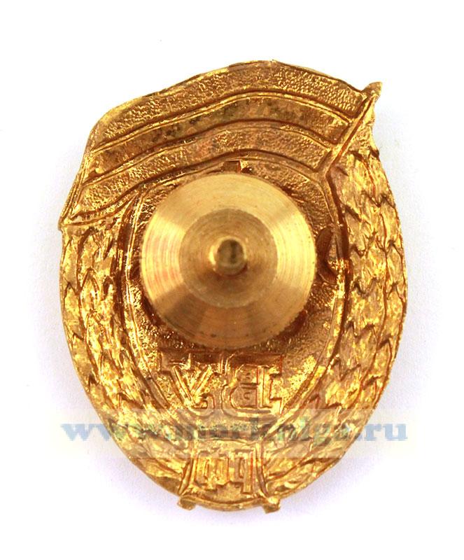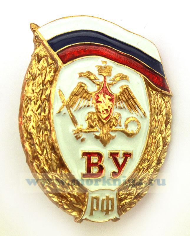 На лицевой стороне знака сверху изображение флага Российской Федерации. По центру герб РФ, чуть ниже буквы ВУ (Военное училище). Снизу по центру надпись «РФ» на белом фоне. Знак обрамляют колосья пшеницы.