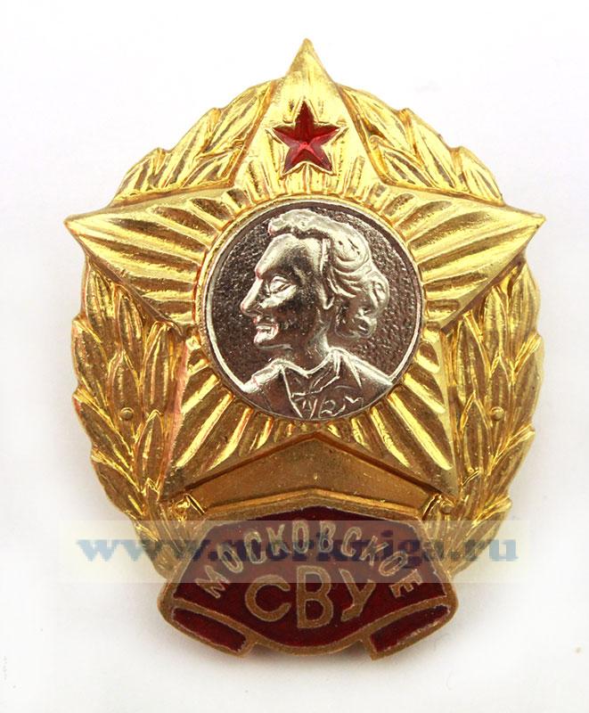 Знак изготовлен из металла золотистого цвета, оформлен в виде лаврового венка, в центр которого помещена пятиконечная рельефная звезда с профилем Суворова. Верхняя часть награды украшена пятиконечной рубиновой звездой, а снизу на красной ленте нанесена надпись «Московское СВУ».