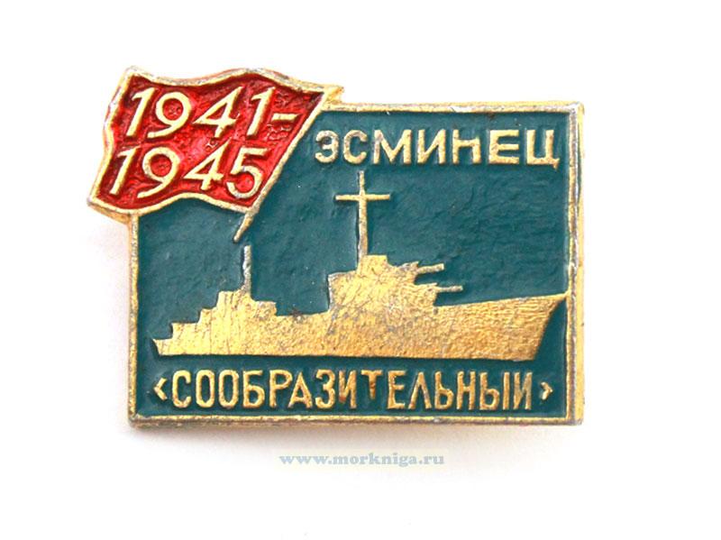 Знак прямоугольной формы. На бирюзовом фоне золотом нанесено изображение эсминца и надписи «Эсминец» сверху и «Сообразительный» снизу знака. В левом верхнем углу на красном фоне памятные цифры «1941-1945».