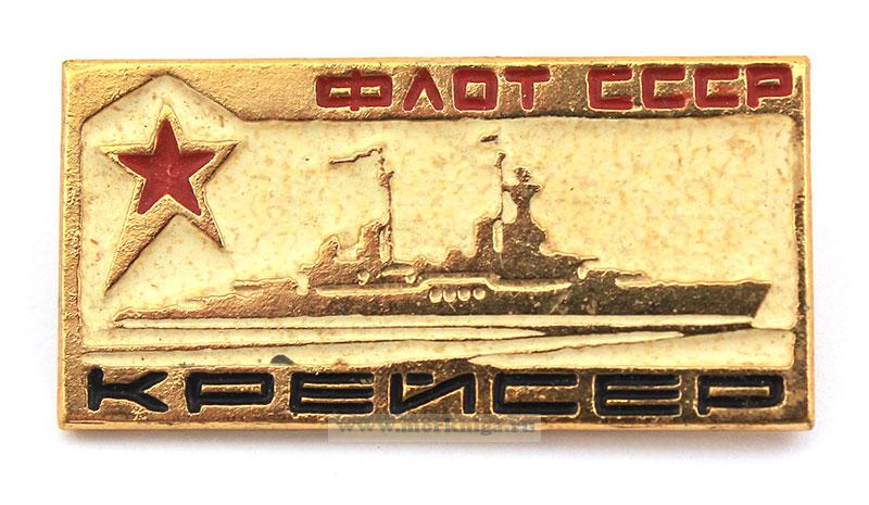 Знак прямоугольной формы. На белом фоне золотом нанесено изображение крейсера проекта 68-бис. С четырех сторон награда окантована золотыми прямоугольными полосами, сверху красным цветом выбита надпись «Флот СССР», снизу черным - «Крейсер». Слева рядом с кораблем выбита красная пятиконечная звезда.