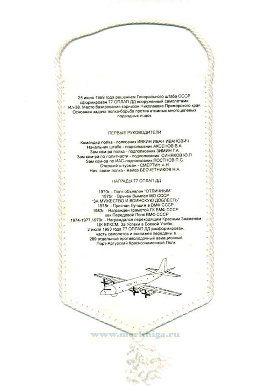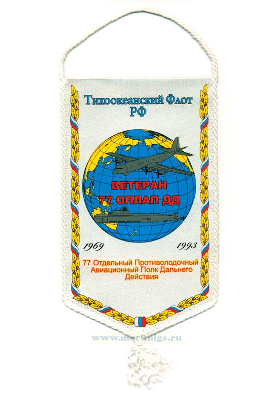 Вымпел "Ветеран 77 ОПЛАП ДД. Тихоокеанский флот РФ. 1969-1993 гг." двухсторонний. На оборотной стороне вымпела нанесена информация о первых руководителях и наградах 77 ОПЛАЛ ДД.