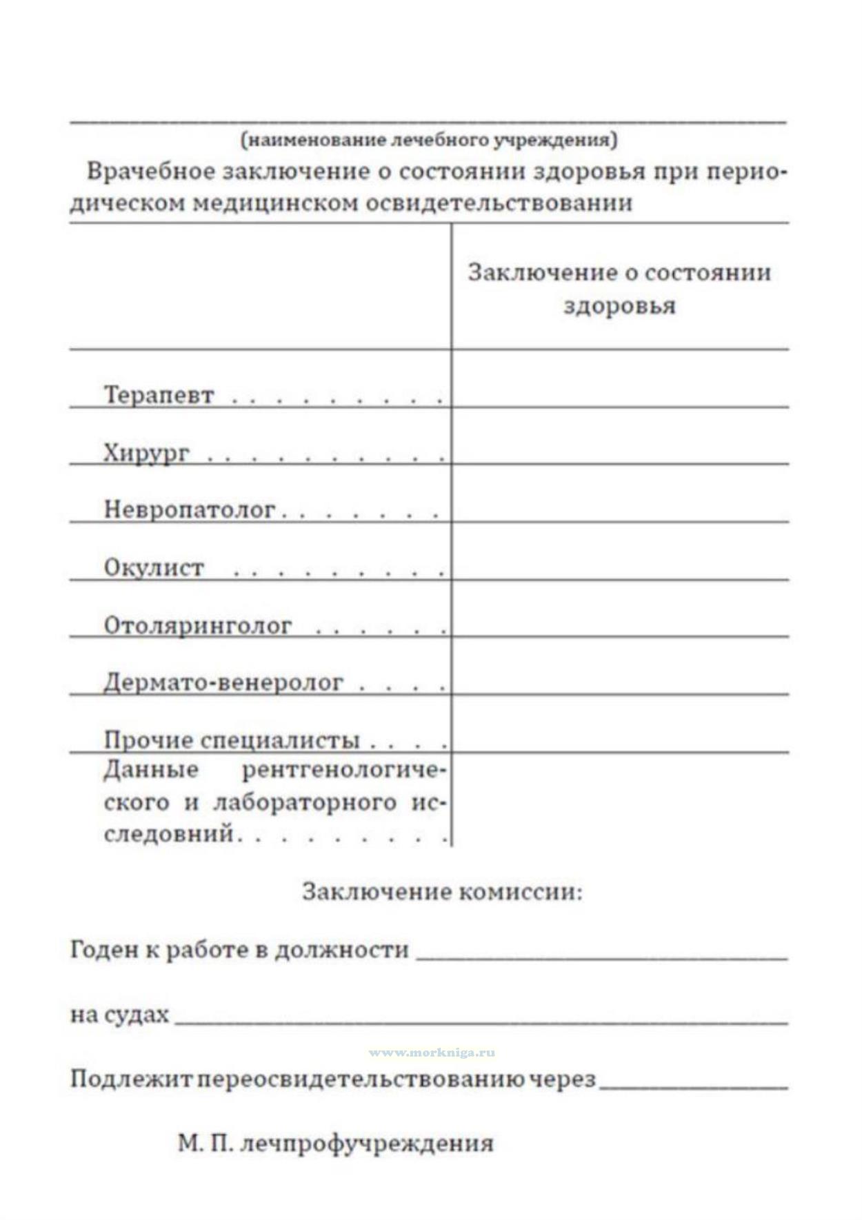 Заключение врачебной комиссии о возможности дальнейшего использования моряка на работе заверяется подписью председателя комиссии и печатью лечебно-профилактического учреждения.