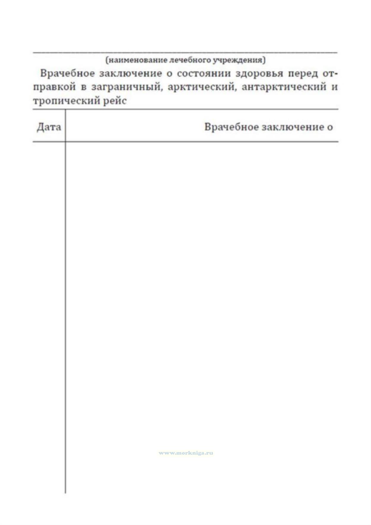 В книжке отведены страницы для записей врачебного заключения о состоянии здоровья моряка перед отправкой в заграничные, арктические, антарктические, тропические рейсы; зубного врача и рекомендаций судовому медику.